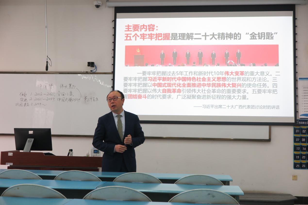 然后,杨院长指出以中国式现代化全面推进中华民族伟大复兴的基石是构建新发展格局,并从5个方面深入地为同学们讲解了二十大精神的“金钥匙”:一是要牢牢把握过去5年工作和新时代10年伟大变革的重大意义;二要牢牢把握习近平新时代中国特色社会主义思想的世界观和方法论;三要牢牢把握以中国式现代化全面推进中华民族伟大复兴的使命任务;四要牢牢把握以伟大自我革命引领伟大社会革命的重要要求;五要牢牢把握团结奋斗的时代要求,广泛凝聚奋进新征程的强大力量。