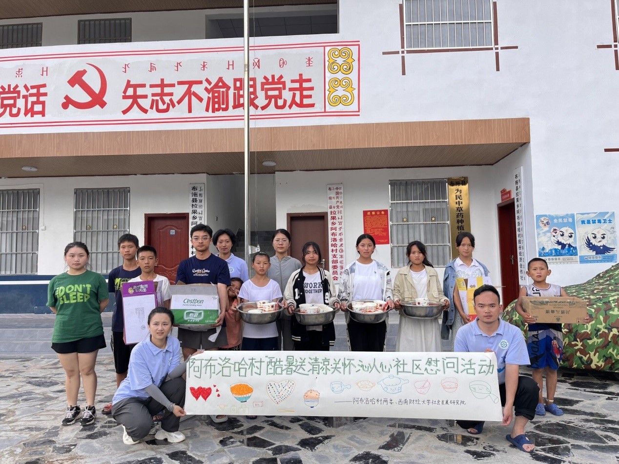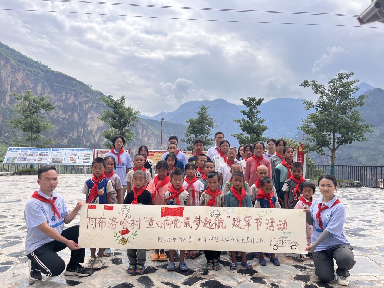 在前期已开展摸底调研的基础上,支部共建签约后的7月25日开始,教工第二党支部书记李权财老师带领7名社会工作专业的研究生,带着满满的热情和期待,带着锅碗瓢盆、大米、蔬菜、米面油等生活物资驻扎在阿布洛哈村,用心扮演探索者、学习者、服务者、行动者的角色,紧锣密鼓地推进各项服务工作的有序开展。在阿布洛哈村两委、乡村振兴驻村工作队的密切协作下,“酷暑送清凉,关怀沁人心”社区志愿服务、“你真的很美”社区化妆节、“童心向党,筑梦起航”建军节、“与青春同频、与艺术共振”社区文艺汇演、“大运会,我们与你在一起”等特色主题活动持续开展。针对阿布洛哈村有更多游客前来观光的情况,服务团队还在村里培育了“儿童解说队”。在此过程中既提升了儿童对村庄的认识和理解,也提升了他们的自信心和自豪感,取得了良好的效果。
