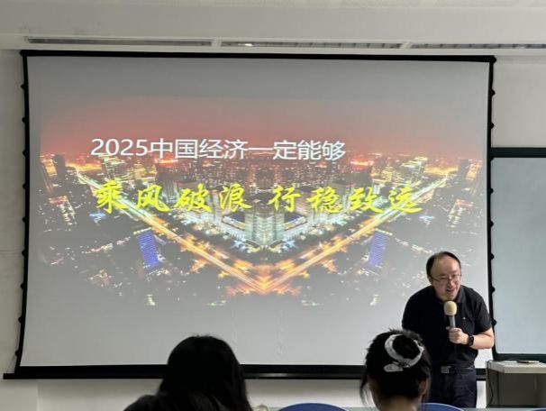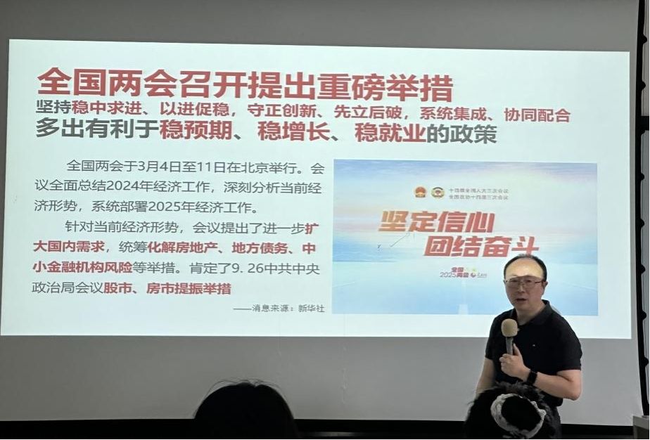 院长杨海洋教授在光华校区明德楼203教室开展了题为“乘风破浪 行稳致远——当前宏观经济形势分析与2025年两会精神学习”的思想政治理论(专题)课。本次课程旨在深入学习国家宏观经济政策与两会精神,引导学生把握时代脉搏,强化使命担当,增强时代责任感。