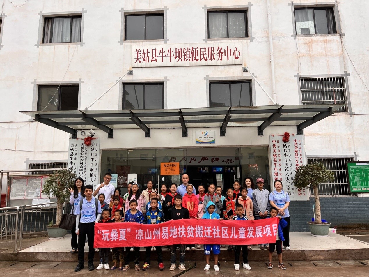 在过往服务的基础上,创新性开展了“玩彝夏”大型易地扶贫搬迁社区儿童发展项目。在喜德县最大的易地扶贫搬迁安置社区—彝欣社区,曲比尔拉(化名)小朋友与新伙伴围坐在一起,在出租女友