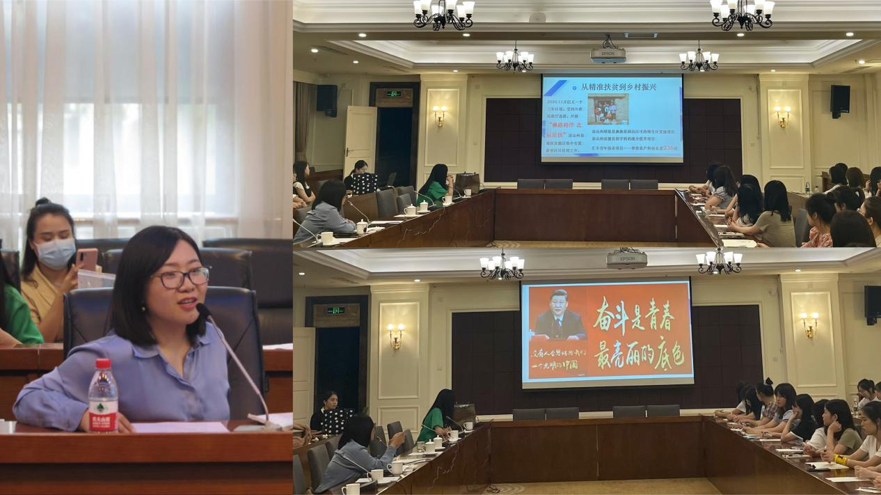 随后党建和学生工作负责人闫文静以去年工作的亮点如凉山州扶贫项目、建党100周年活动、Fellow人物志、师生纪实等向同学们介绍了研究院相关工作情况,并引用习近平总书记的寄语“奋斗是青春最亮丽的底色”鼓励同学们争做不断奋斗、有理想、有情怀的青年。