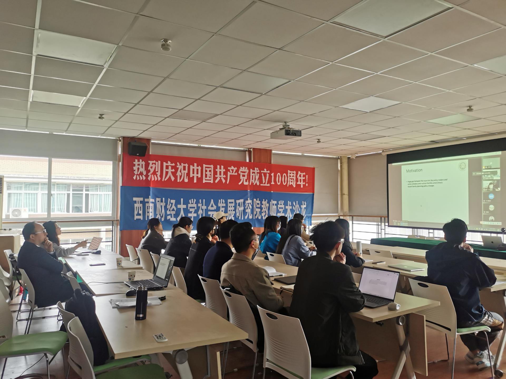 杨海洋院长,陈曼婷副教授、陈怡霏副教授,蒋和超老师以及经济社会学研究所全体同学在通博楼A509会议室参与讲座。