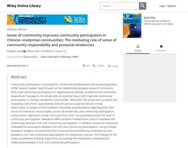 教师邓湘树、魏真瑜等撰写的论文《Sense of community improves community participation in Chinese residential communities: The mediating role of sense of community responsibility and prosocial tendencies》。该文揭示了提升我国居民参与社区治理的心理路径。