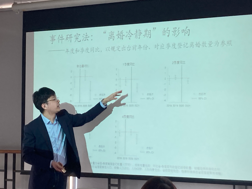 首先,董浩老师谈到本文标题经历的多次修改,对于副标题的恰当应用,指出离婚的影响因素,纠正了目前大众和媒体对于离婚率与离结比概念的错误理解与使用,介绍了“离婚冷静期”的相关政策和背景。接着,他谈到了本研究的实证策略,使用的核心数据为民政部公布的分省季度统计数据,国家统计局数据、司法裁判文书大数据和基于互联网搜索大数据的百度指数辅助分析。运用事件研究和双重差分等政策研究方法交叉验证“离婚冷 静期”规定在全国层面的平均干预效应,探究“离婚冷静期”降低离婚登记数量的影响机制。同时,董浩老师指出本研究所受数据的限制,希望在未来能有更多微观行为数据和定性证据可以结合本文的理论机制探索发现,为进一步推进我国家庭理论发展做出贡献。