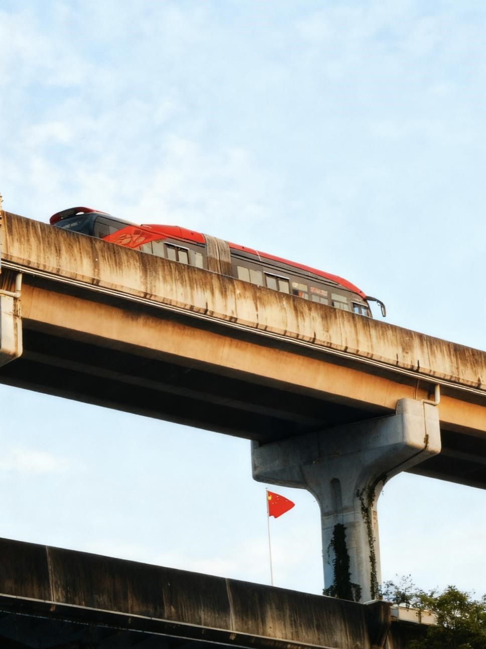 镜头故事:高架桥上的城市公交如一条红色纽带,在国庆的晴空下奔行——它既是城市基建的具象,更似载着万千游子归乡的“移动乡愁”。