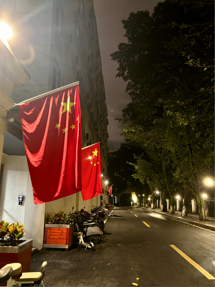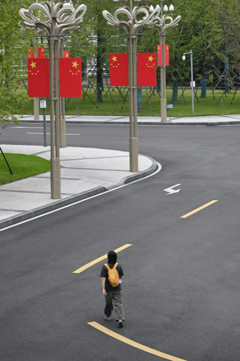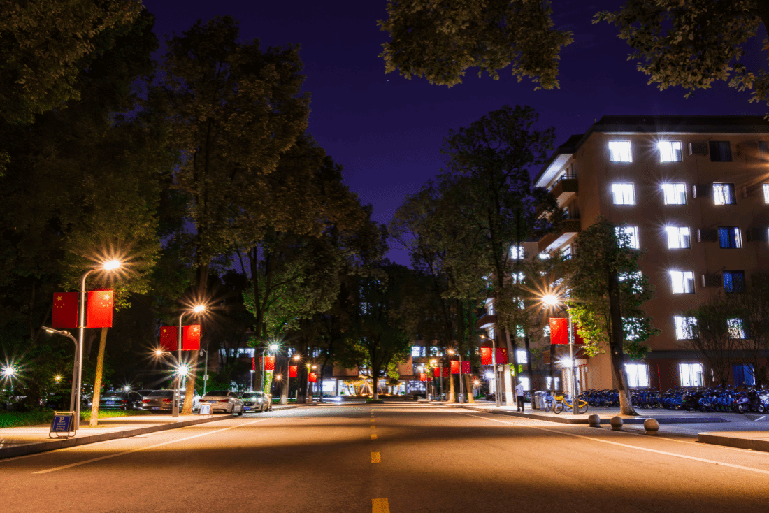 国庆时节,校园宿舍大道因这一面面飘扬的国旗而不同。那热烈的红在灯光下熠熠生辉,五颗金星仿佛在诉说着国家的沧桑与辉煌。没有盛大的阅兵式,没有喧嚣的庆典,可这寻常街巷里的国旗,却以最朴素的方式,将爱国情怀融入了生活的肌理。